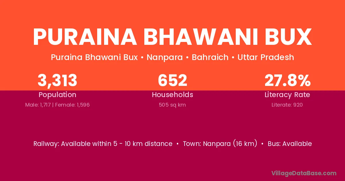 Nanpara (16 km) is the nearest town to Puraina Bhawani Bux village for major economic activities and is located approximately 16 km away.