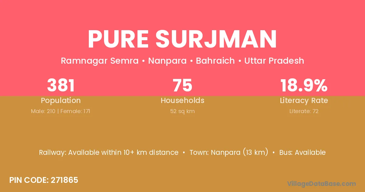Nanpara (13 km) is the nearest town to Pure Surjman village for major economic activities and is located approximately 13 km away.