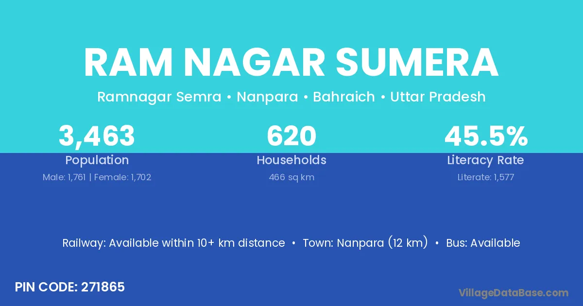 Nanpara (12 km) is the nearest town to Ram Nagar Sumera village for major economic activities and is located approximately 12 km away.
