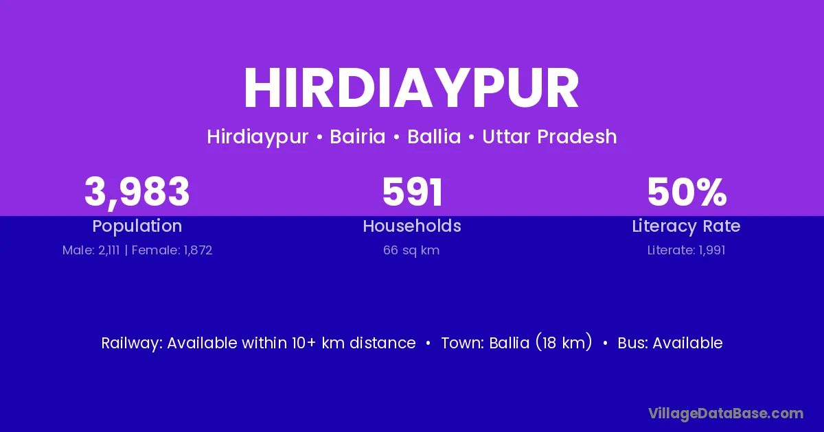 Ballia (18 km) is the nearest town to Hirdiaypur village for major economic activities and is located approximately 18 km away.