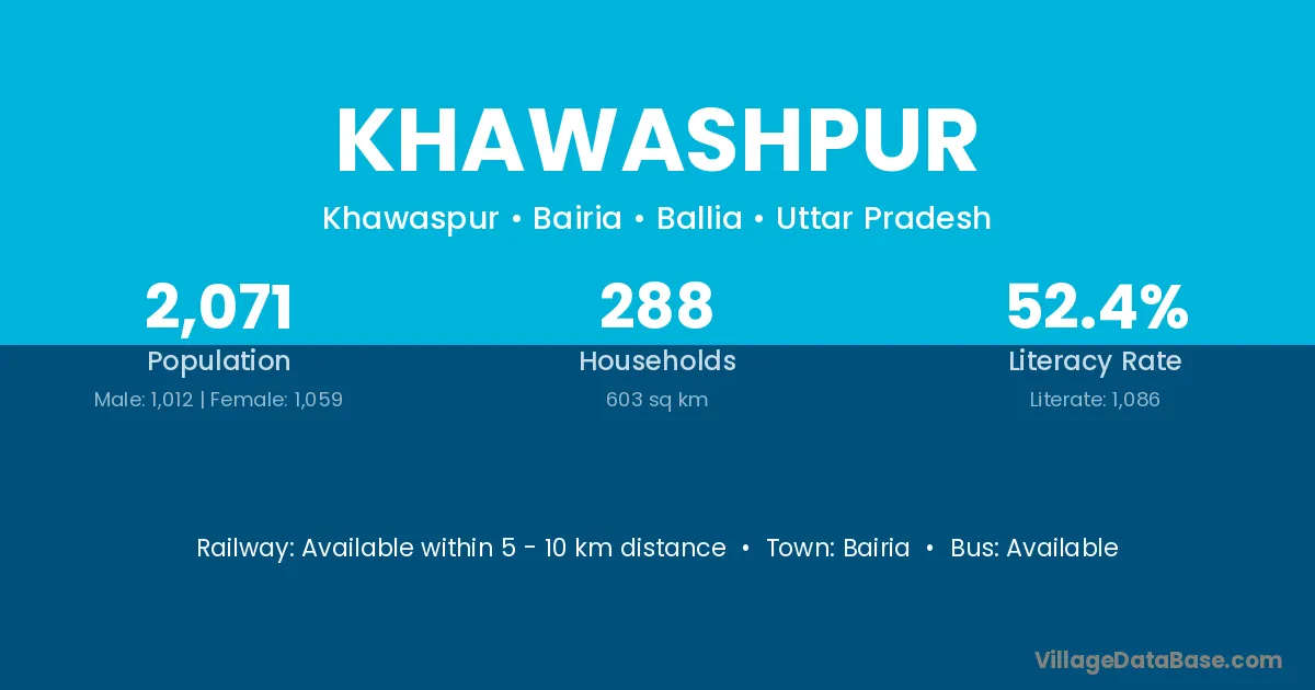 Khawashpur village has a total population of 2,071 people, of which 1,012 are males and 1,059 are females.