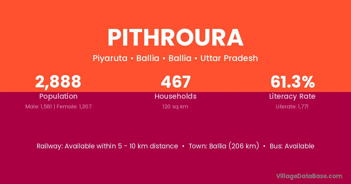 Ballia (206 km) is the nearest town to Pithroura village for major economic activities and is located approximately 206 km away.