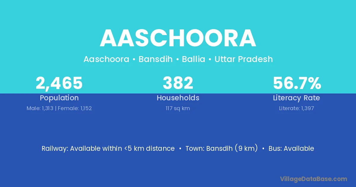 Bansdih (9 km) is the nearest town to Aaschoora village for major economic activities and is located approximately 9 km away.