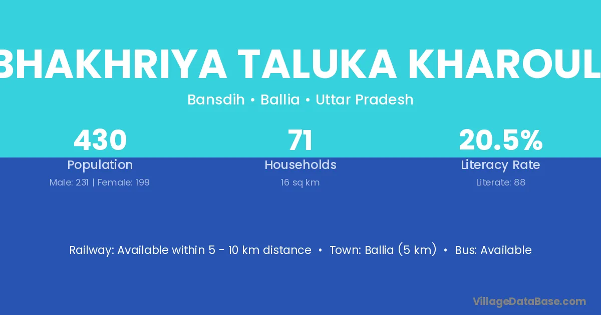 Ballia (5 km) is the nearest town to Bhakhriya Taluka Kharouli village for major economic activities and is located approximately 5 km away.