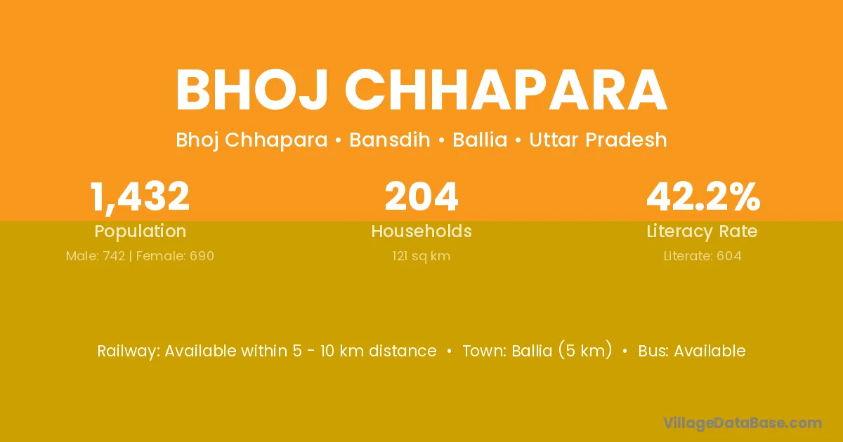 Ballia (5 km) is the nearest town to Bhoj Chhapara village for major economic activities and is located approximately 5 km away.