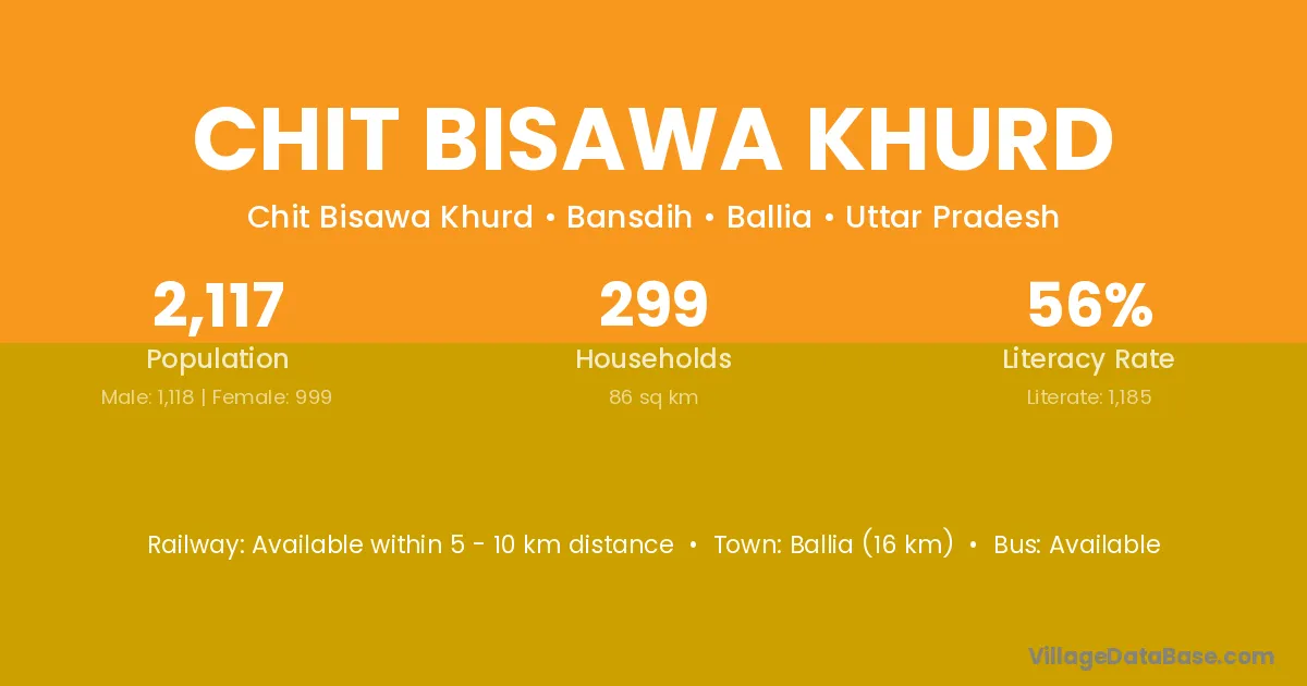Ballia (16 km) is the nearest town to Chit Bisawa Khurd village for major economic activities and is located approximately 16 km away.