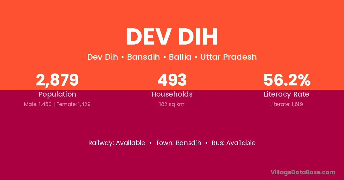 Dev Dih village has a total population of 2,879 people, of which 1,450 are males and 1,429 are females.