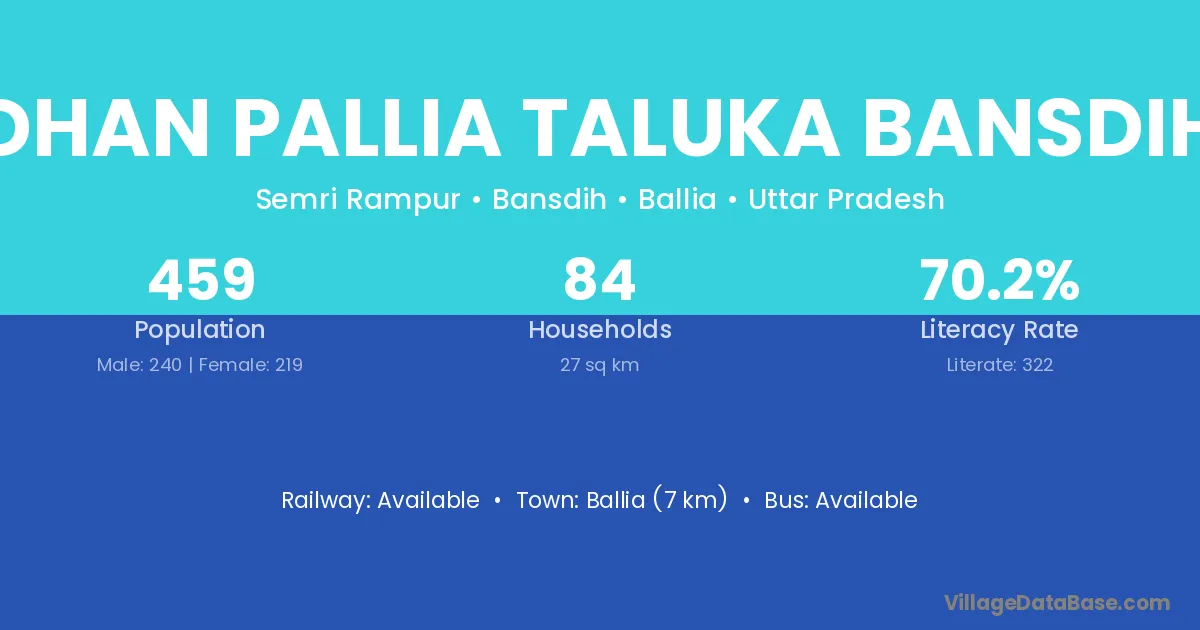 Ballia (7 km) is the nearest town to Dhan Pallia Taluka Bansdih village for major economic activities and is located approximately 7 km away.