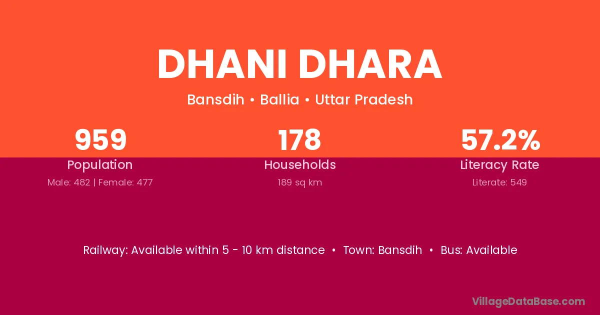 Dhani Dhara village has a total population of 959 people, of which 482 are males and 477 are females.