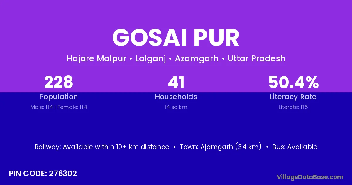 The literacy rate of Gosai Pur village is 50.36%. Male literacy stands at 60.12% and female literacy at 39.66%.