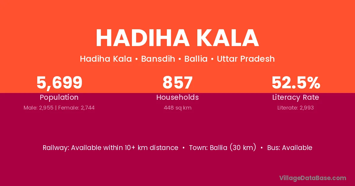 Ballia (30 km) is the nearest town to Hadiha Kala village for major economic activities and is located approximately 30 km away.