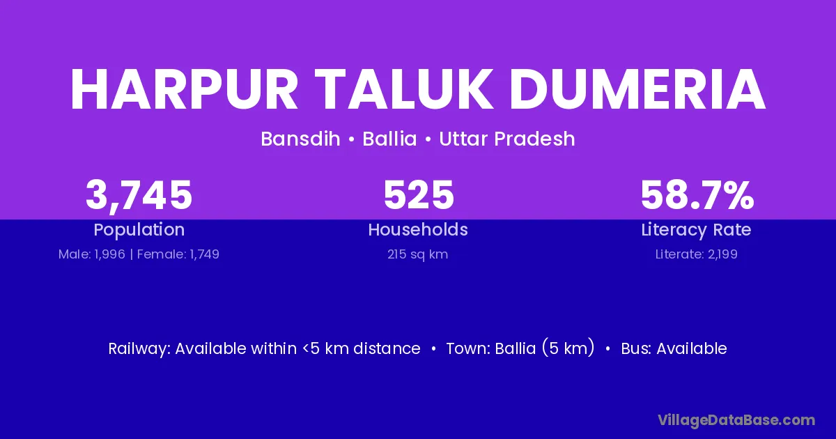 Ballia (5 km) is the nearest town to Harpur Taluk Dumeria village for major economic activities and is located approximately 5 km away.