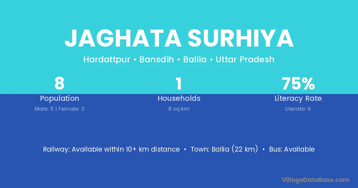 Jaghata Surhiya village has a total population of 8 people, of which 5 are males and 3 are females.