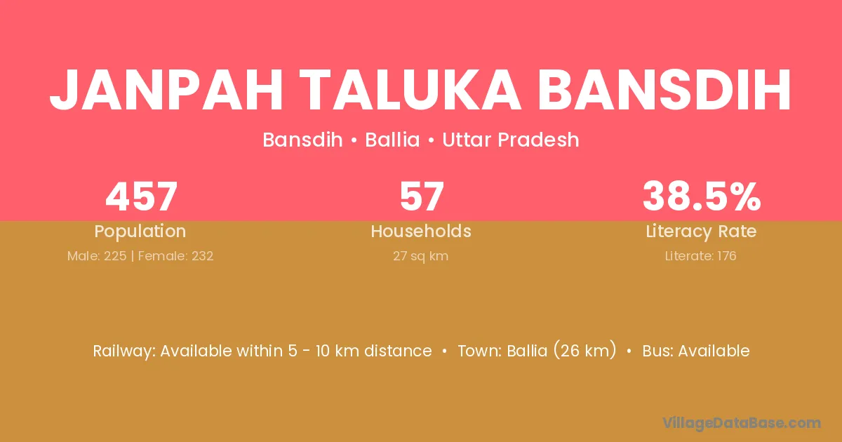 Ballia (26 km) is the nearest town to Janpah Taluka Bansdih village for major economic activities and is located approximately 26 km away.
