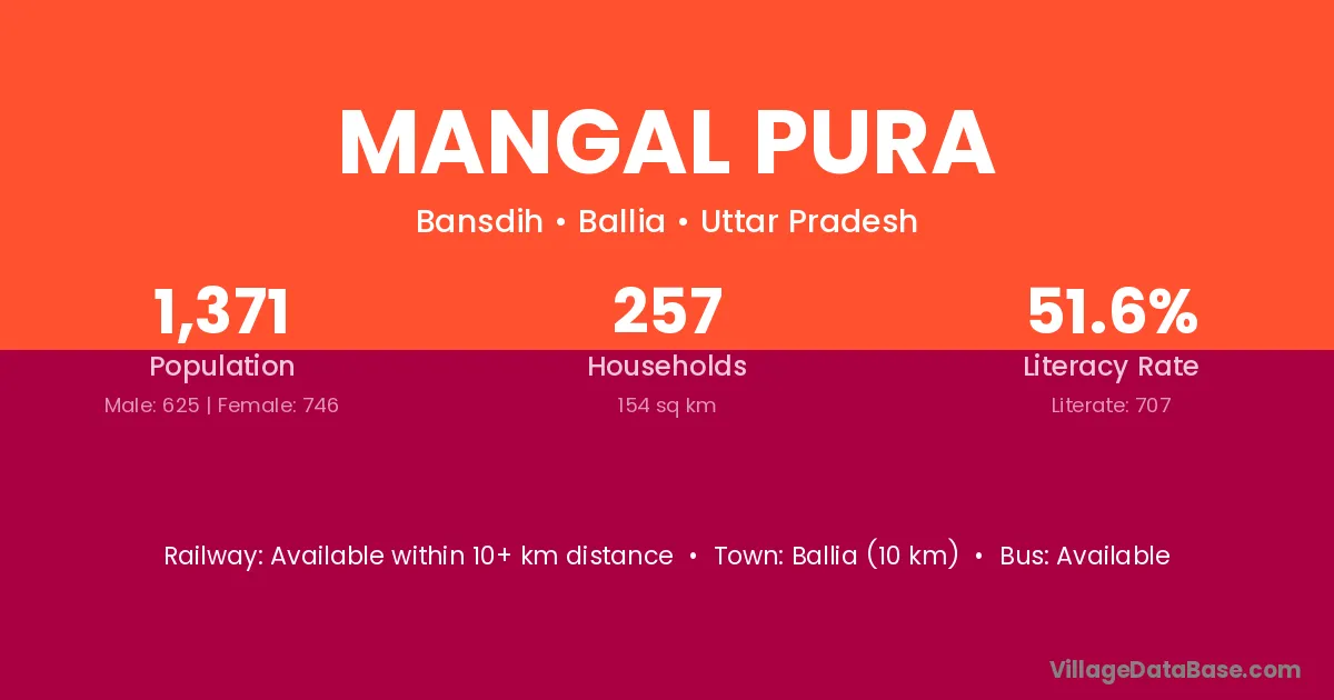 Ballia (10 km) is the nearest town to Mangal Pura village for major economic activities and is located approximately 10 km away.