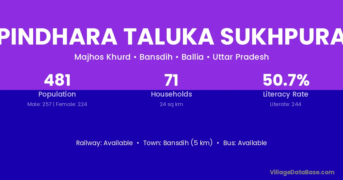 Pindhara Taluka Sukhpura village has a total population of 481 people, of which 257 are males and 224 are females.
