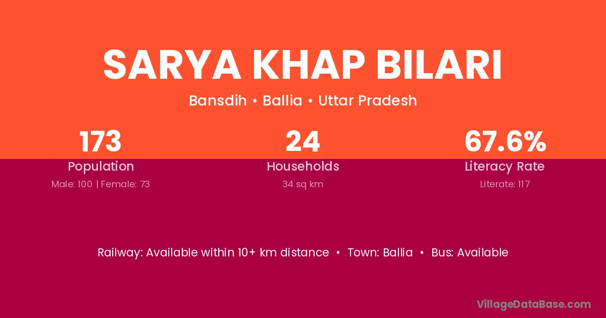 Sarya Khap Bilari village has a total population of 173 people, of which 100 are males and 73 are females.