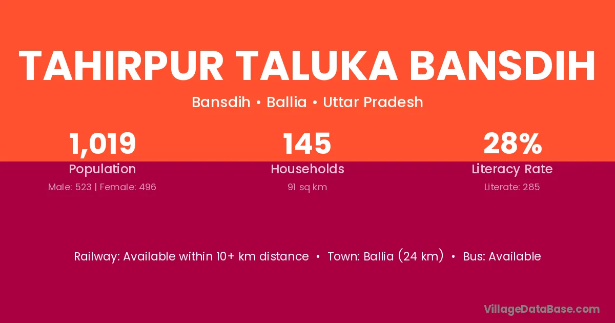 Ballia (24 km) is the nearest town to Tahirpur Taluka Bansdih village for major economic activities and is located approximately 24 km away.