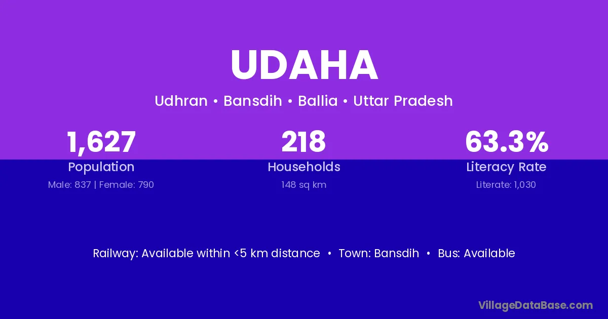 Udaha village has a total population of 1,627 people, of which 837 are males and 790 are females.