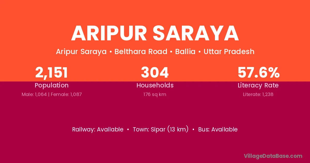 Aripur Saraya village has a total population of 2,151 people, of which 1,064 are males and 1,087 are females.