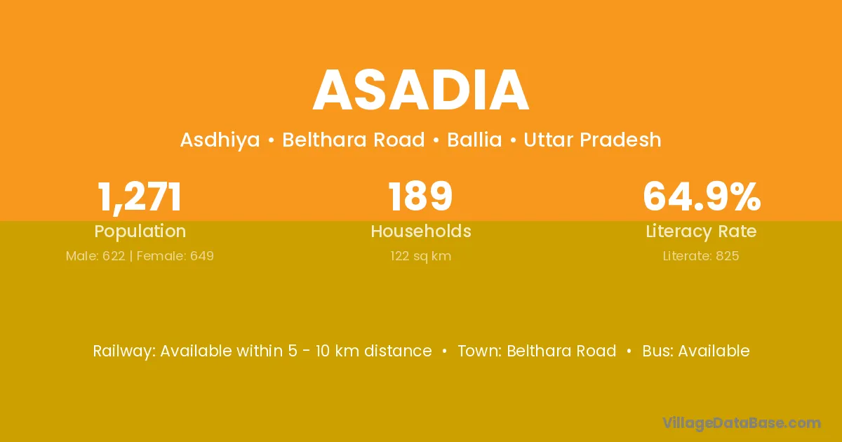 Asadia village has a total population of 1,271 people, of which 622 are males and 649 are females.