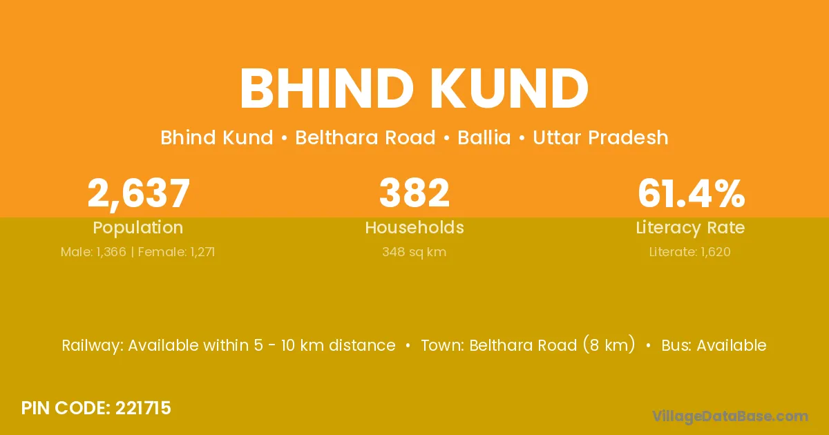 Belthara Road (8 km) is the nearest town to Bhind Kund village for major economic activities and is located approximately 8 km away.