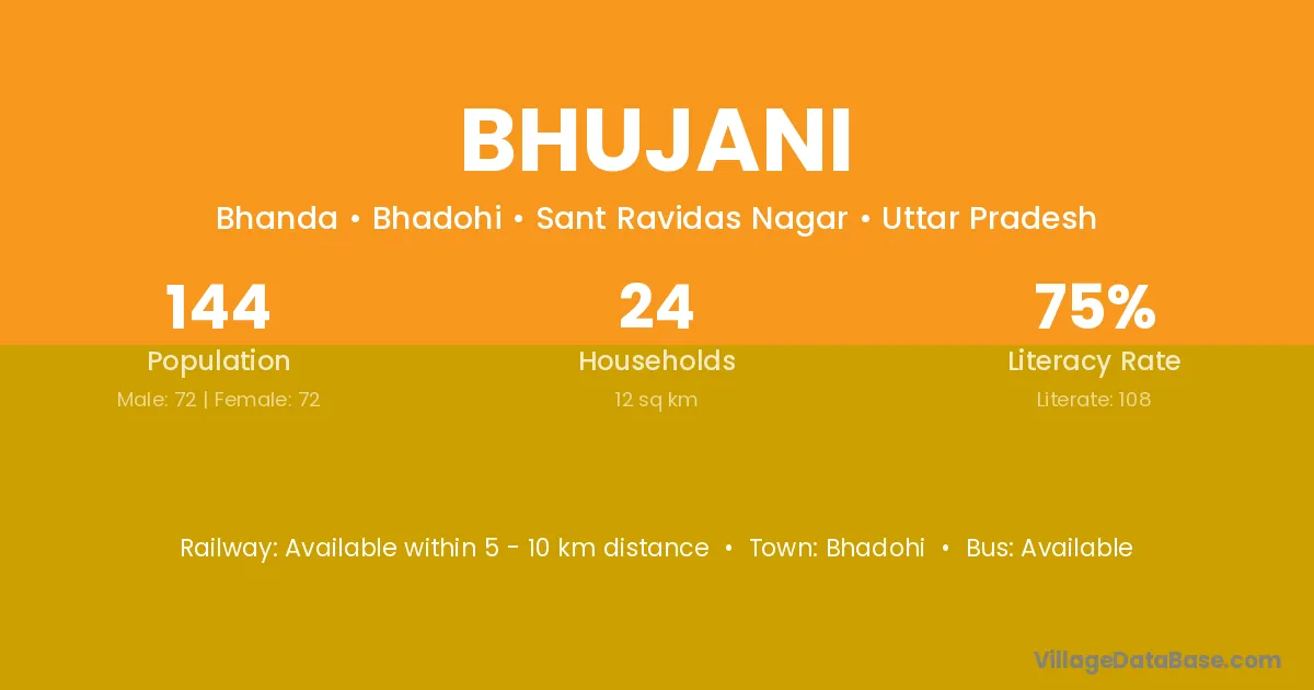 Belthara Road (8 km) is the nearest town to Bhujani village for major economic activities and is located approximately 8 km away.