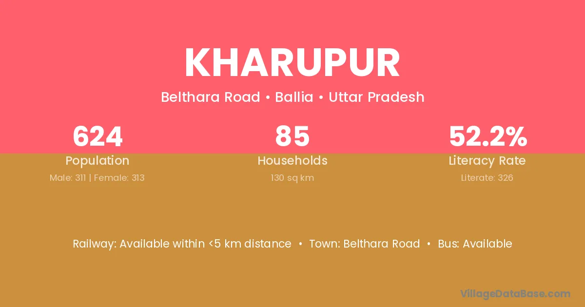 Kharupur village has a total population of 624 people, of which 311 are males and 313 are females.