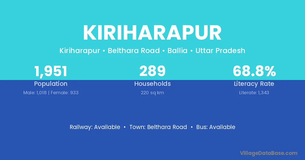 Kiriharapur village has a total population of 1,951 people, of which 1,018 are males and 933 are females.