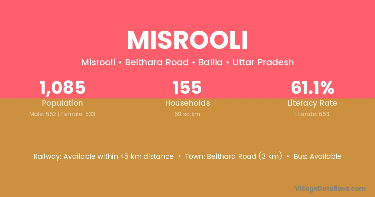 Misrooli village has a total population of 1,085 people, of which 552 are males and 533 are females.