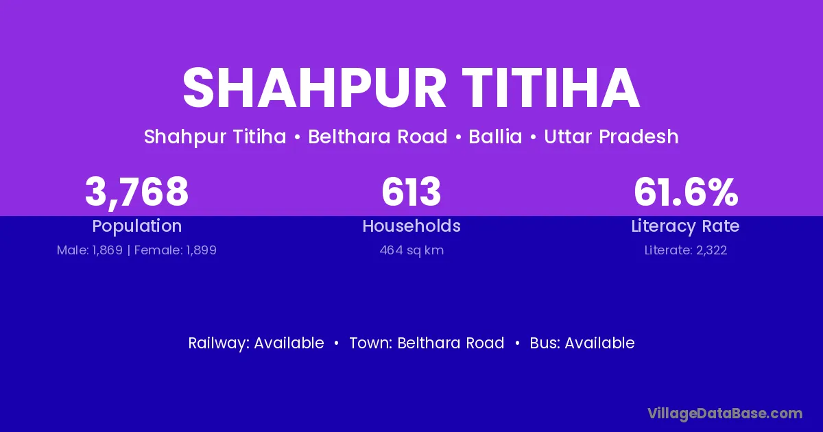 Shahpur Titiha village has a total population of 3,768 people, of which 1,869 are males and 1,899 are females.