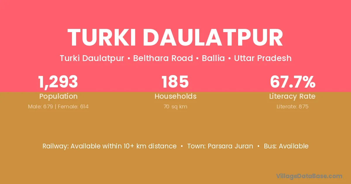 Turki Daulatpur village has a total population of 1,293 people, of which 679 are males and 614 are females.