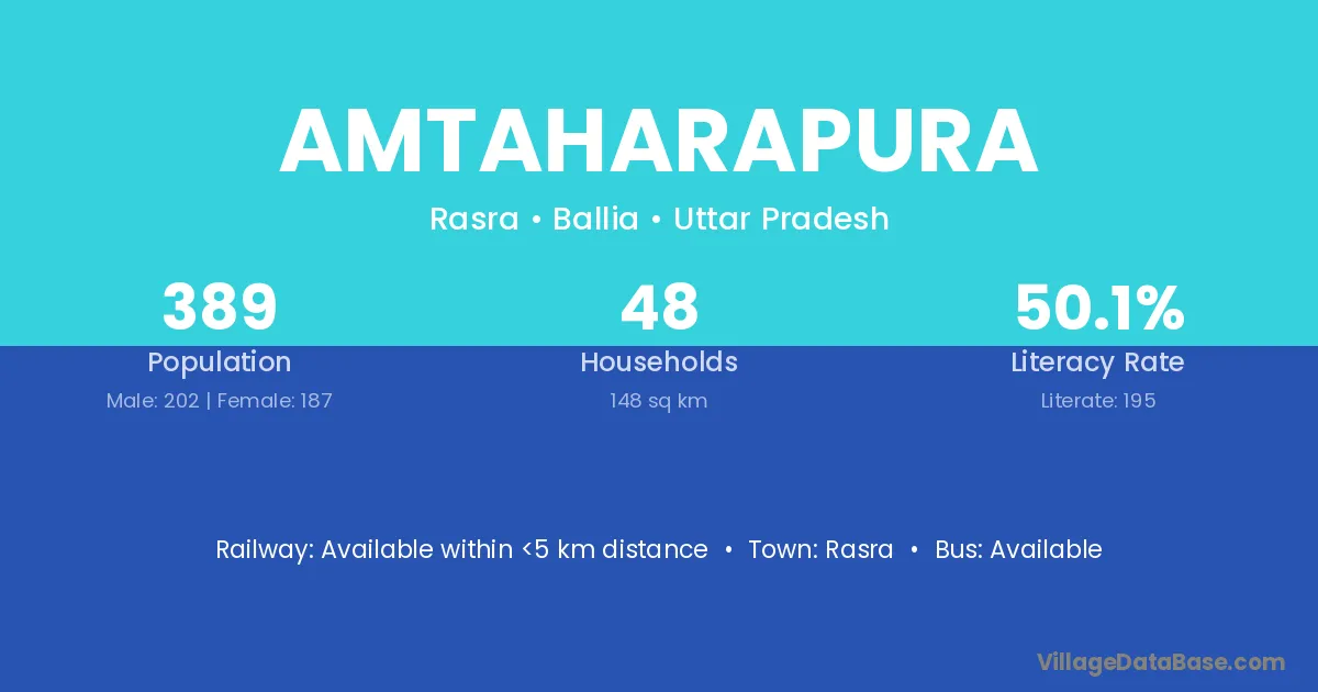 Amtaharapura village has a total population of 389 people, of which 202 are males and 187 are females.