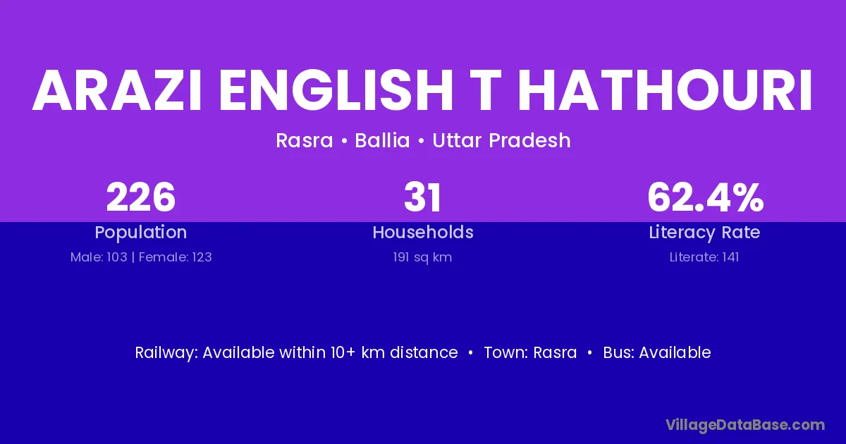 Arazi English T Hathouri village has a total population of 226 people, of which 103 are males and 123 are females.