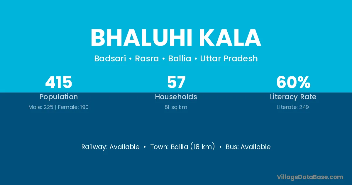Ballia (18 km) is the nearest town to Bhaluhi Kala village for major economic activities and is located approximately 18 km away.