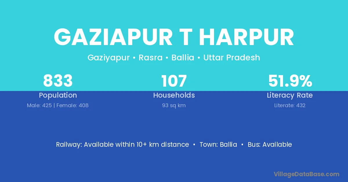 Gaziapur T Harpur village has a total population of 833 people, of which 425 are males and 408 are females.