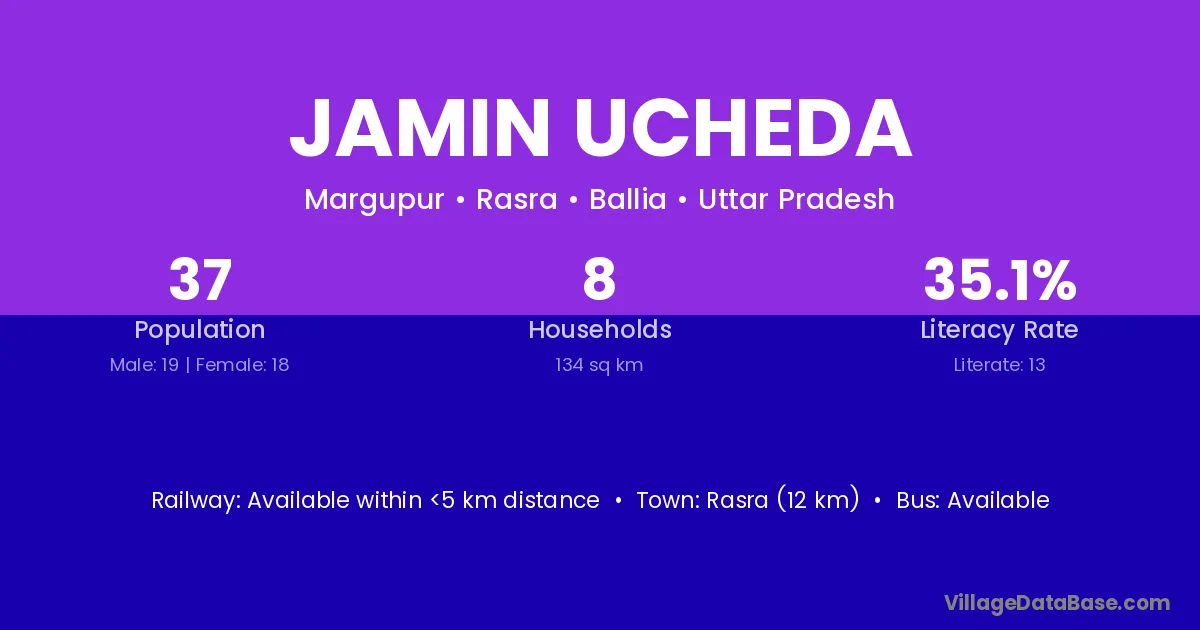 The literacy rate of Jamin Ucheda village is 35.14%. Male literacy stands at 57.89% and female literacy at 11.11%.