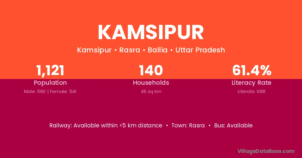 Kamsipur village has a total population of 1,121 people, of which 580 are males and 541 are females.