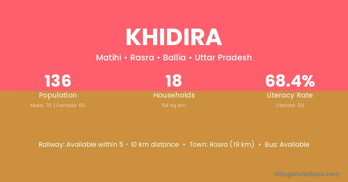 Khidira village has a total population of 136 people, of which 70 are males and 66 are females.