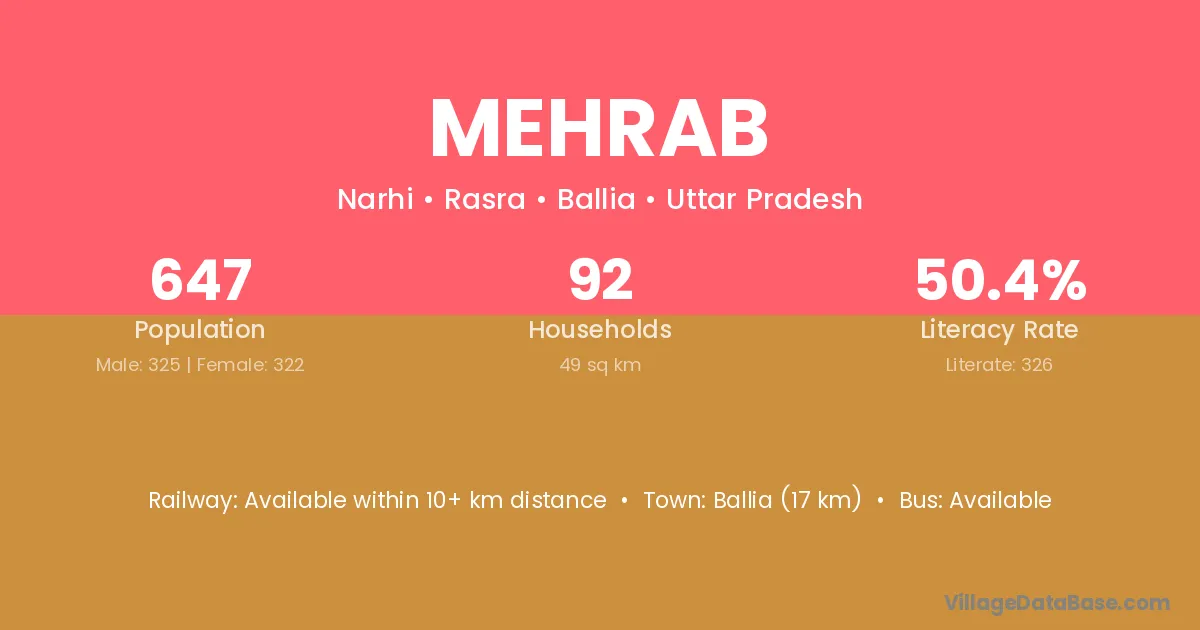 Ballia (17 km) is the nearest town to Mehrab village for major economic activities and is located approximately 17 km away.