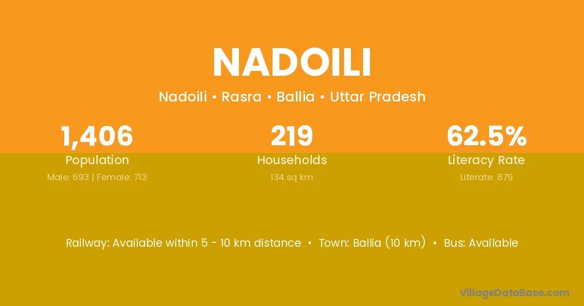 Ballia (10 km) is the nearest town to Nadoili village for major economic activities and is located approximately 10 km away.