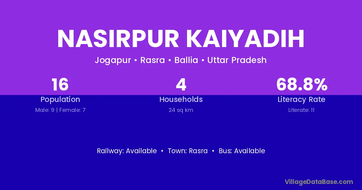 Nasirpur Kaiyadih village has a total population of 16 people, of which 9 are males and 7 are females.