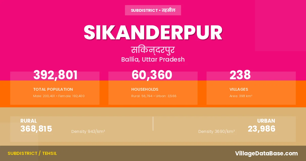 According to the 2011 census The total area of Sikanderpur Tehsil is 398 km², with a population of 392801 people. The population density is 988 inhabitants per square kilometre, and there are approximately 60360 houses in the sub district.