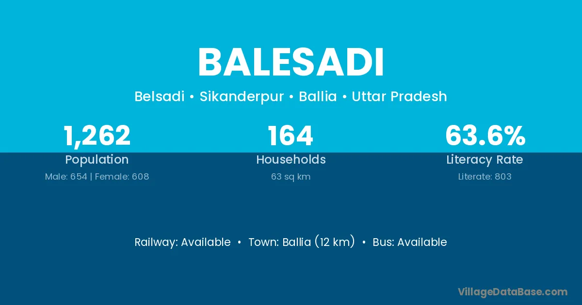 Ballia (12 km) is the nearest town to Balesadi village for major economic activities and is located approximately 12 km away.