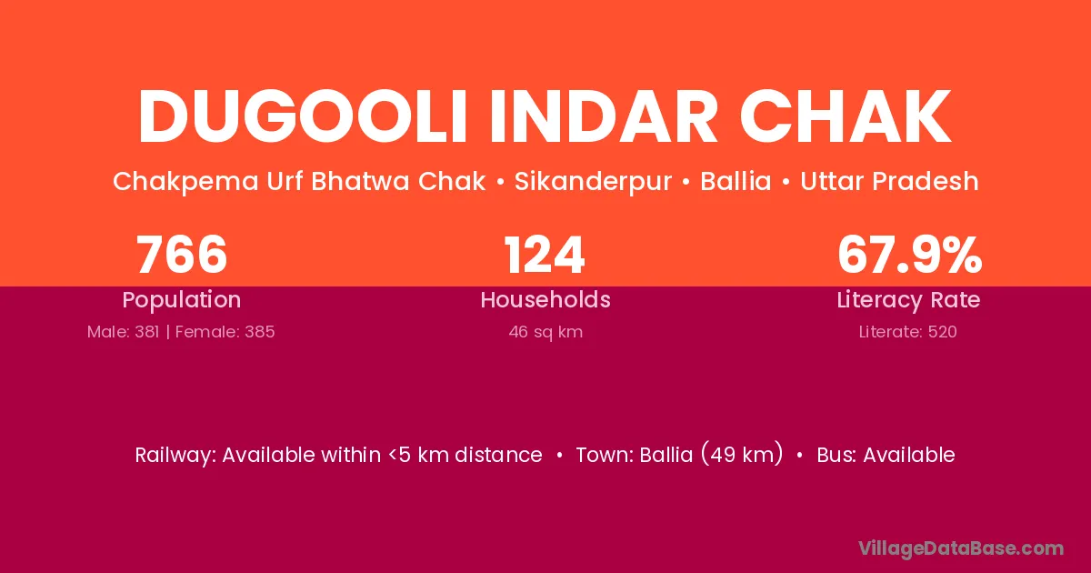 Dugooli Indar Chak village has a total population of 766 people, of which 381 are males and 385 are females.