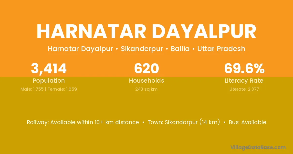 Sikandarpur (14 km) is the nearest town to Harnatar Dayalpur village for major economic activities and is located approximately 14 km away.