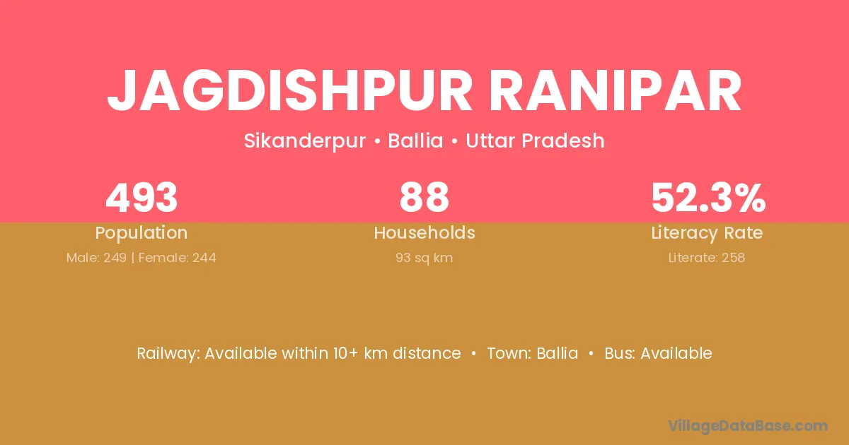 Jagdishpur Ranipar village has a total population of 493 people, of which 249 are males and 244 are females.