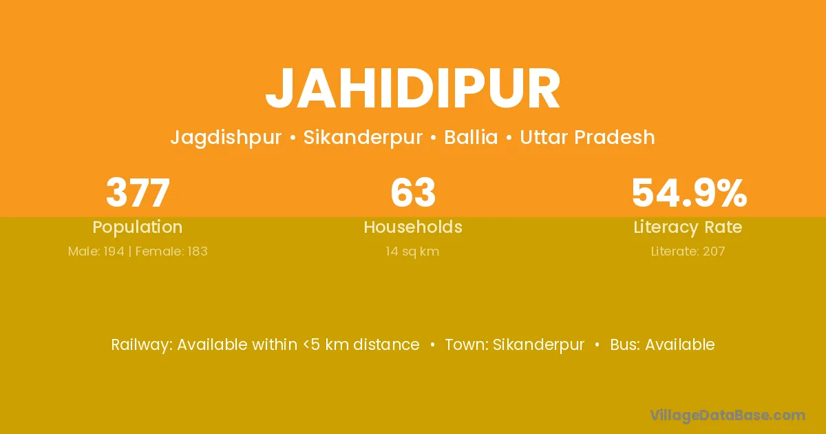 Jahidipur village has a total population of 377 people, of which 194 are males and 183 are females.