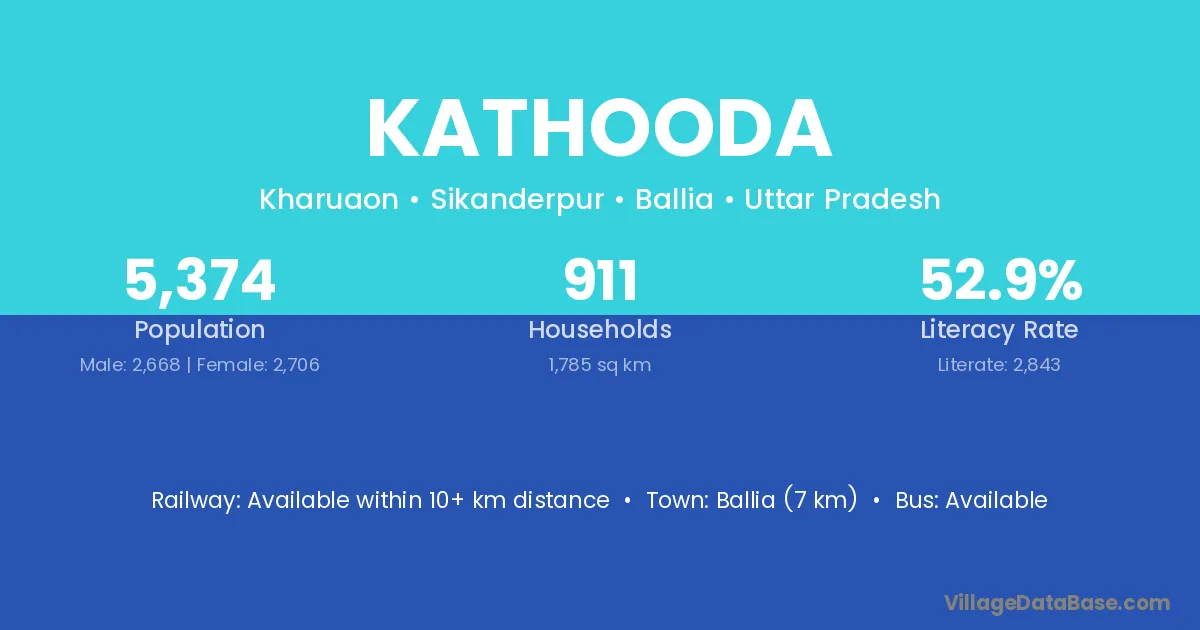 Ballia (7 km) is the nearest town to Kathooda village for major economic activities and is located approximately 7 km away.