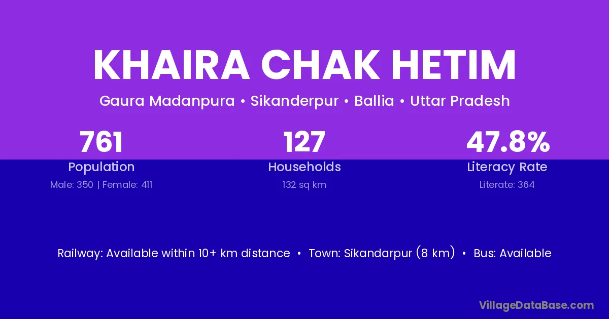 Sikandarpur (8 km) is the nearest town to Khaira Chak Hetim village for major economic activities and is located approximately 8 km away.